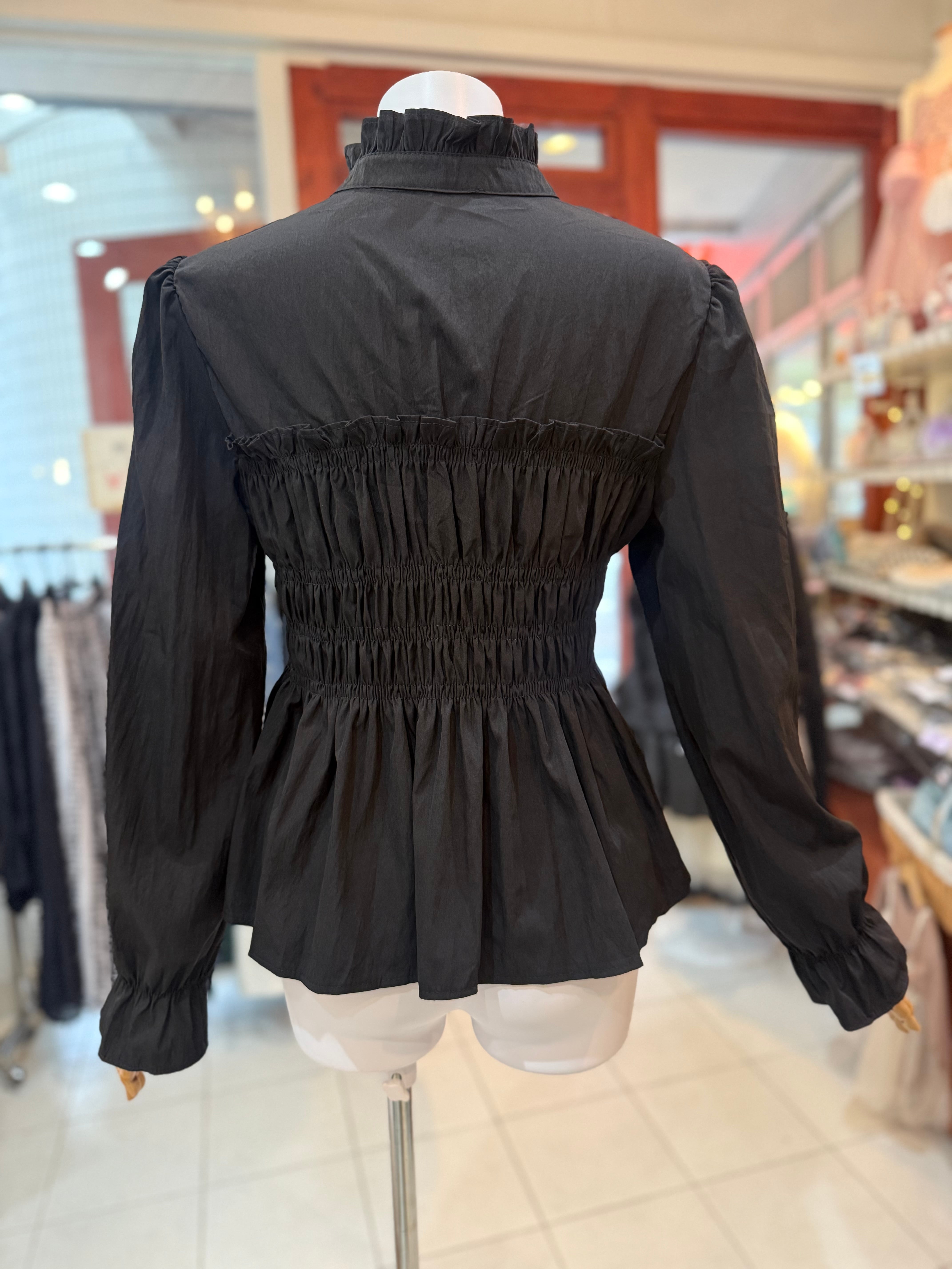 【再販決定】半額♡スタンドフリルカラー×シャーリングブラウス/ブラック