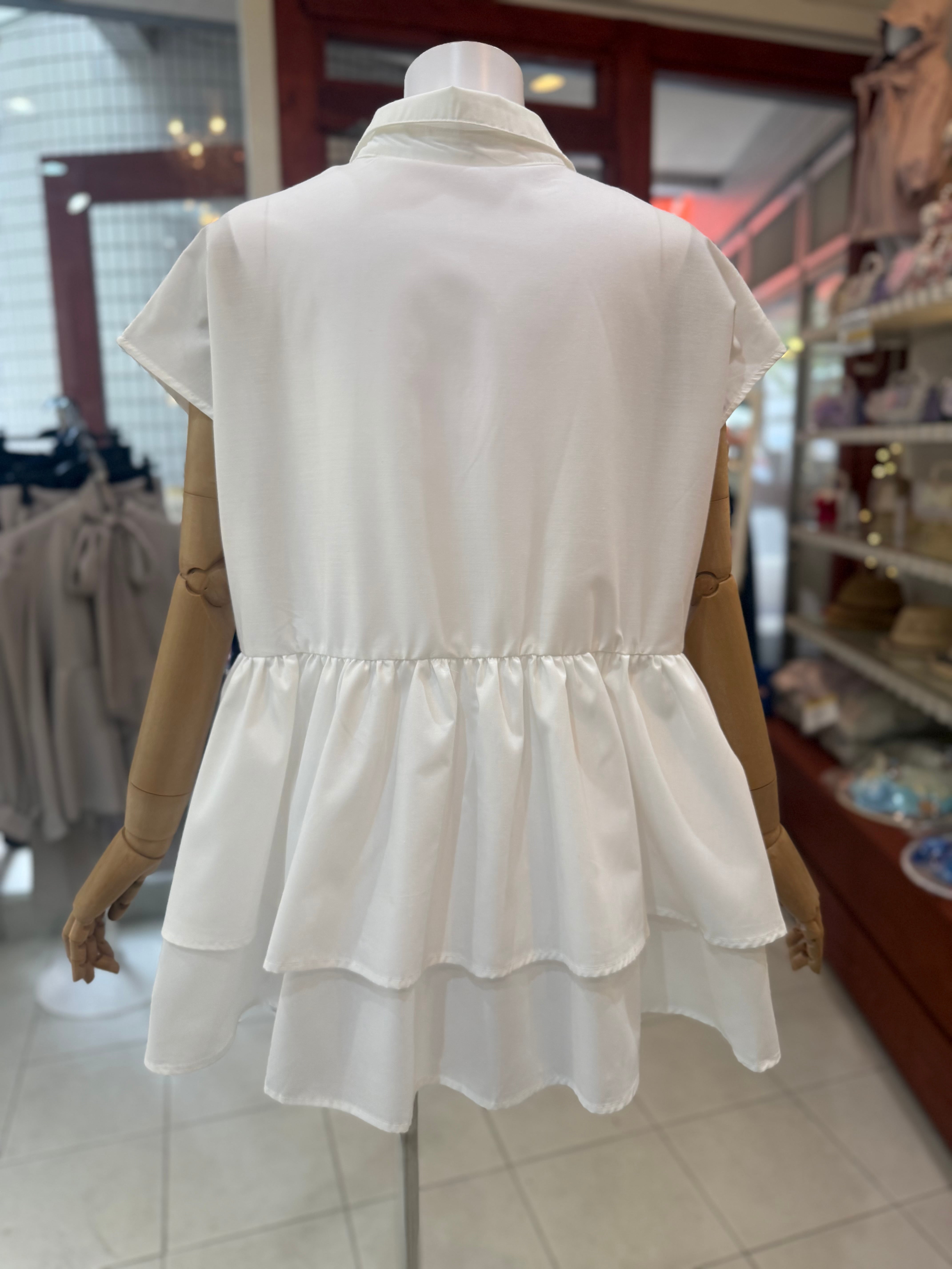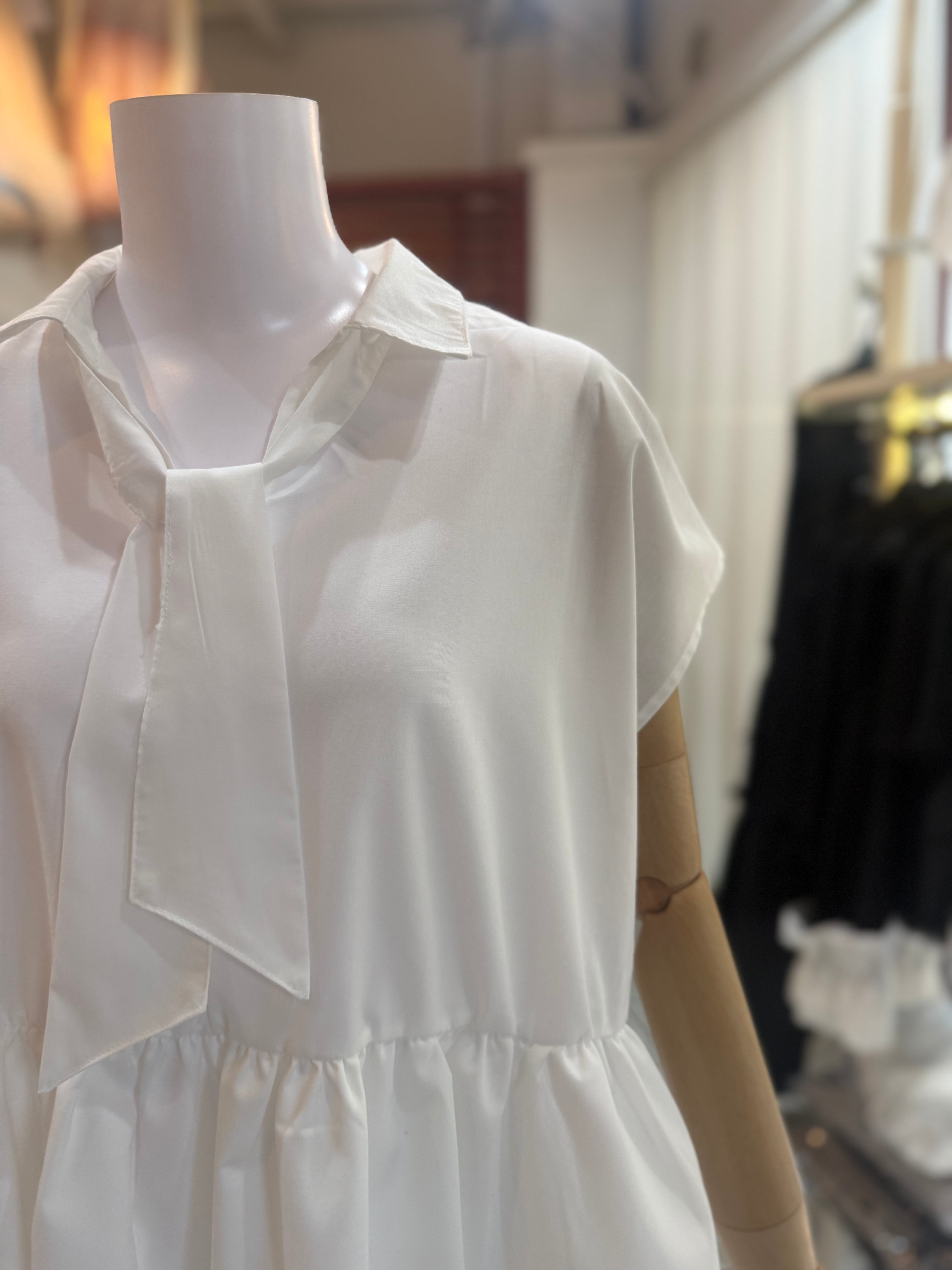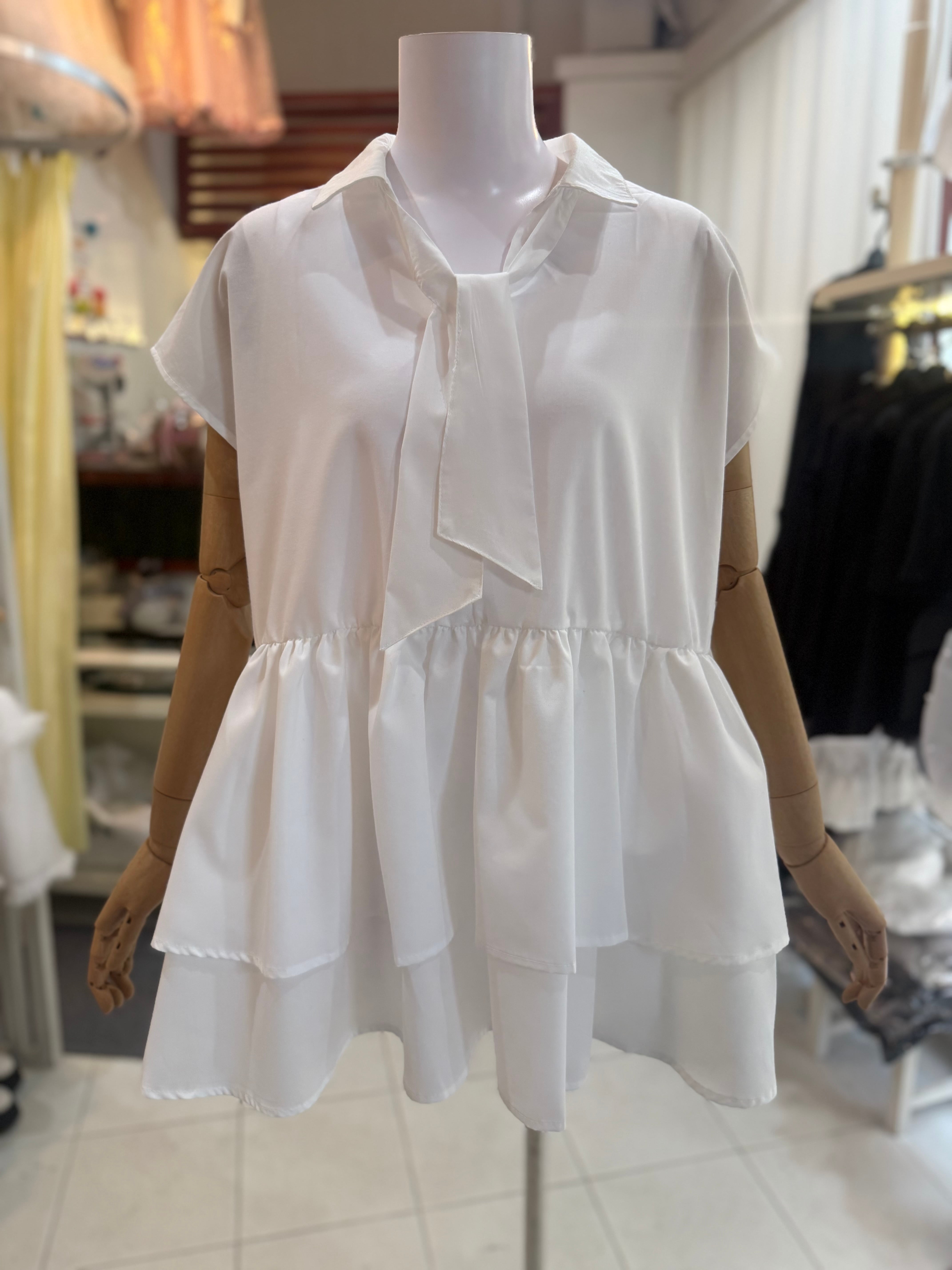 ボタンで着脱可能タイ(リボン)ペプラムブラウス/ホワイト
